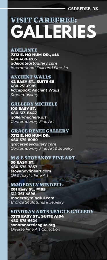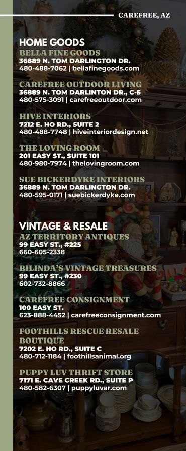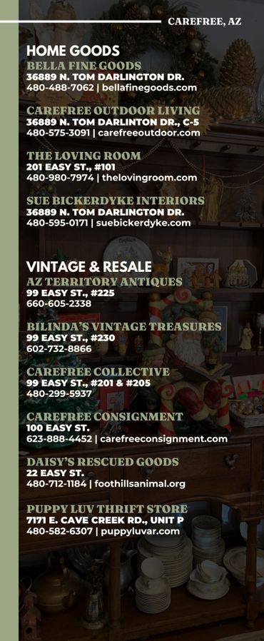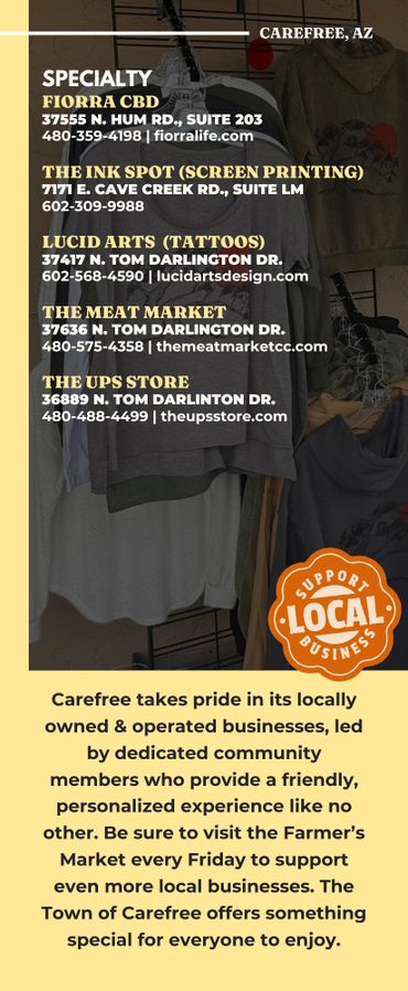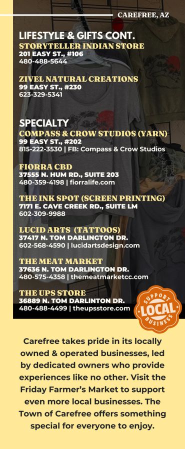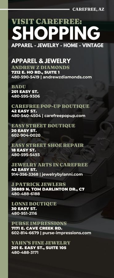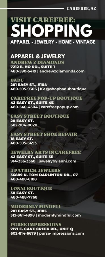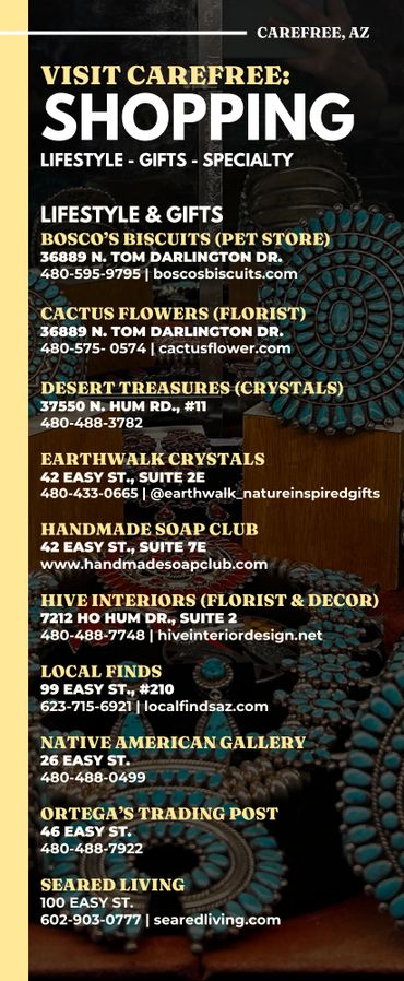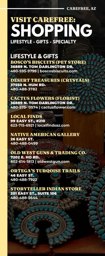 Carefree is a shopper’s paradise, offering an eclectic mix of unique boutiques and galleries that cater to every taste and style. From high-end apparel and handcrafted jewelry to rare antiques, original art, and home décor, there's something for everyone. Explore charming shops filled with knick-knacks, gifts, and locally made treasures that reflect the spirit of the Southwest. Whether you're looking to refresh your wardrobe, find the perfect piece of art, or pick up a thoughtful gift, Carefree’s vibrant shopping scene promises a delightful experience.